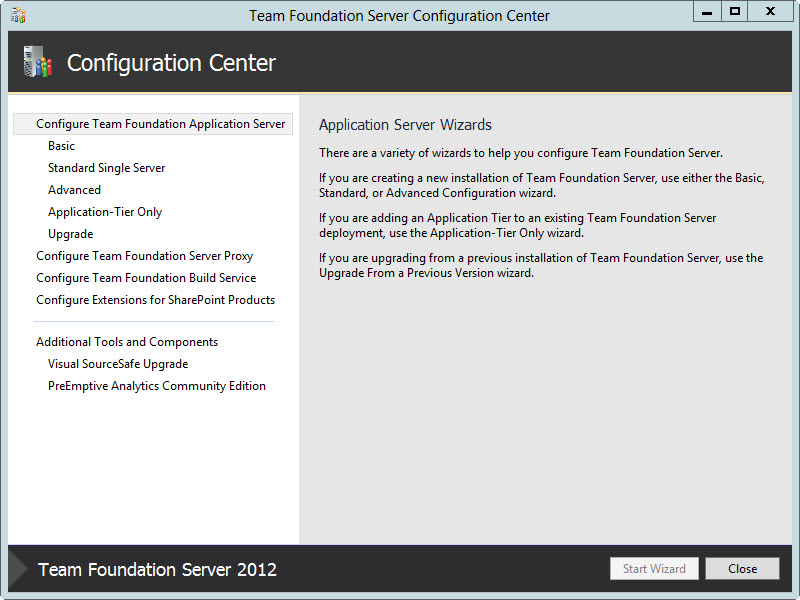 Once installation is completed (it is quick) and Team Foundation Server Configuration Center wizard will be launched.